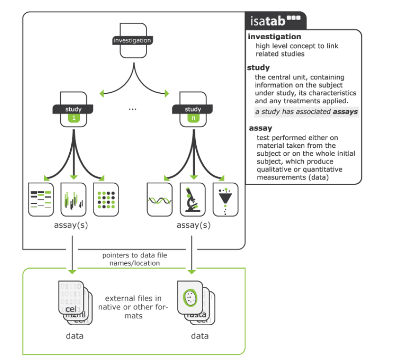 The workbook is based on the Investigation/Study/Assay (ISA) Metadata Framework (see Figure 2.1), a well-recognised hierarchal framework with a set of community specifications to support provision of “rich descriptions of experimental metadata (i.e., sample characteristics, technology and measurement types, sample-to-data relationships) so that the resulting data and discoveries are reproducible and reusable”.1 The ISA framework is used in reporting data generated from experiments in the life sciences and environmental fields, e.g., Harvard Medical School LINCS Database, MetaboLights. In addition to following the ISA approach for experimental metadata, the excel workbook also contains additional fields in each of the files (investigation, study, assay) to fulfil PARC’s ambitions of “increased re(use) of scientific and regulatory data” and “one substance = one assessment”.