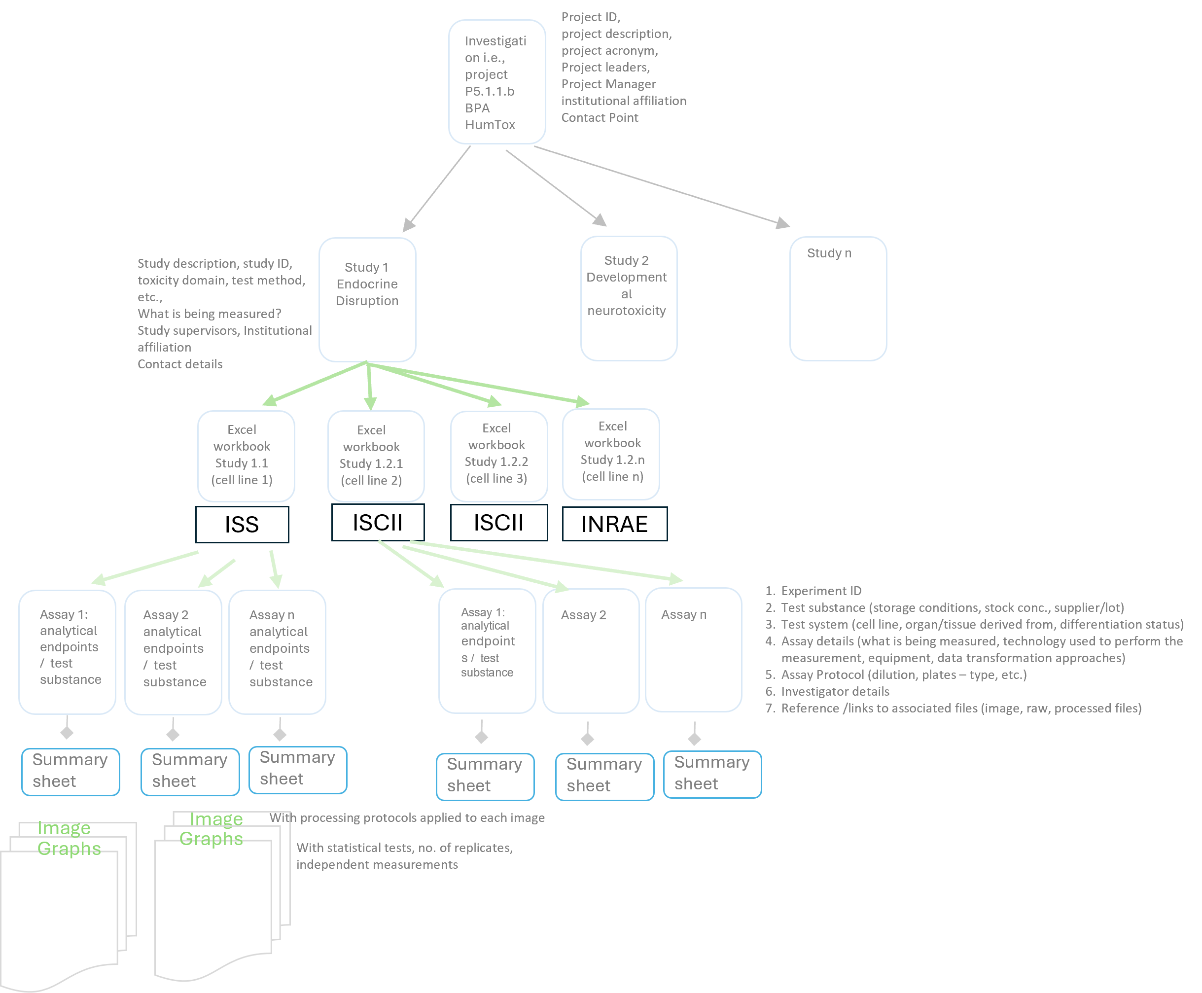 Each WP5 project (i.e., investigation) will contain several activities (i.e., studies, to align with the ISA Framework) and each study may contain several endpoints (e.g., cell death, genotoxicity, immunotoxicity etc.) whose metadata and data need to be integrated to address the specific goals of the project. Within the particular project (used in the example here - WP5 project P5.1.1.b_Y1_BPA_HumTox_BfR, experiments related to neurotoxicity can be Study 1, immunotoxicity can be Study 2, so on and so forth, as shown schematically in Figure 2.2. This approach, in our perspective, helps in defining a self-contained unit of research. Additionally, the protocols, guidance documents (e.g., IL2 Test Guidelines for in vitro immunotoxicity8), test system, etc. which are followed would be specific to the field/experiments, and not a mix of many experimental objectives and test methodologies9. Thus, each study will have an excel workbook, with specific assays measuring analytical endpoints as worksheets. The excel sheets (i.e., module), “Project”, and “Action” will have fields which detail the necessary metadata associated with the data for uploading in various repositories and/or to the PARC CRA Hub.